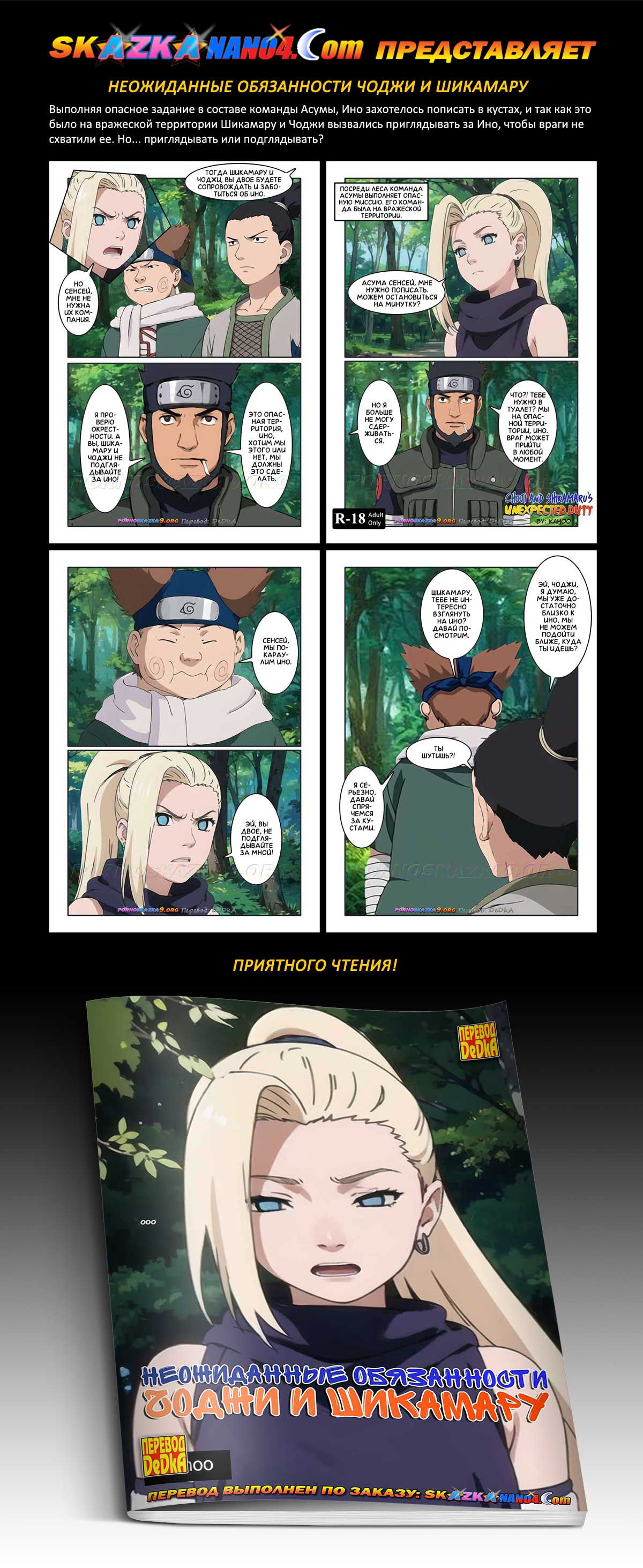 Выполняя опасное задание в составе команды Асумы, Ино захотелось пописать в кустах, и так как это было на вражеской территории Шикамару и Чоджи вызвались приглядывать за Ино, чтобы враги не схватили ее. Но… приглядывать или подглядывать?