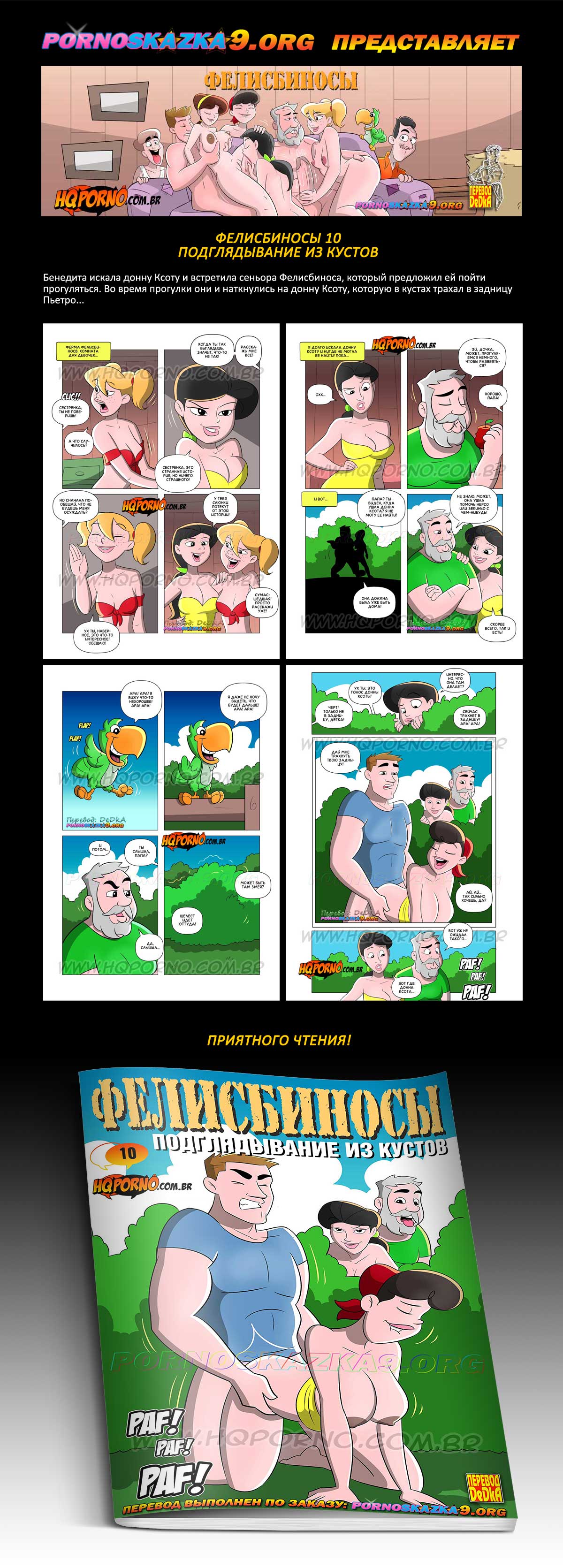 Порно комикс «Фелисбиносы. Часть 10. Подглядывание из кустов.» Бенедита искала донну Ксоту и встретила сеньора Фелисбиноса, который предложил ей пойти прогуляться. Во время прогулки они и наткнулись на донну Ксоту, которую в кустах трахал в задницу Пьетро…